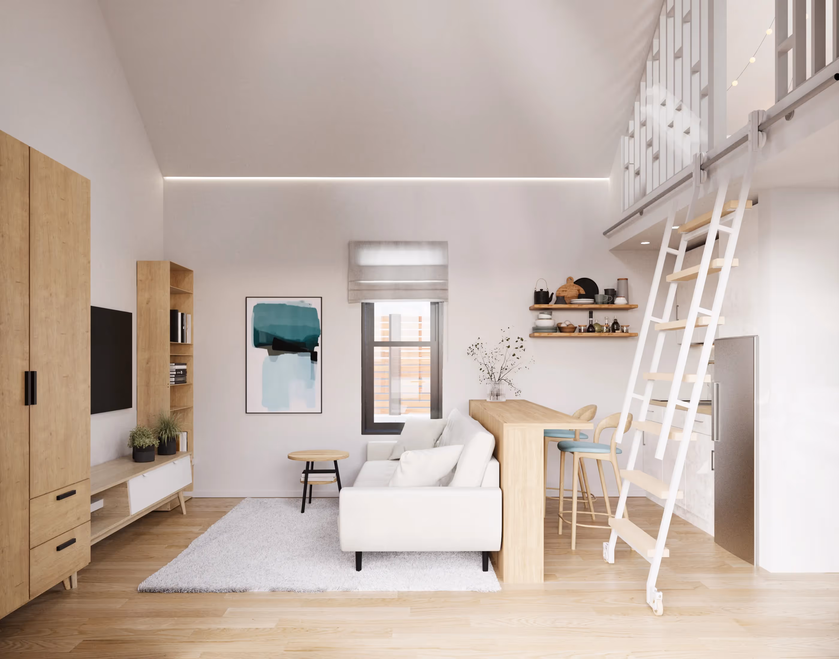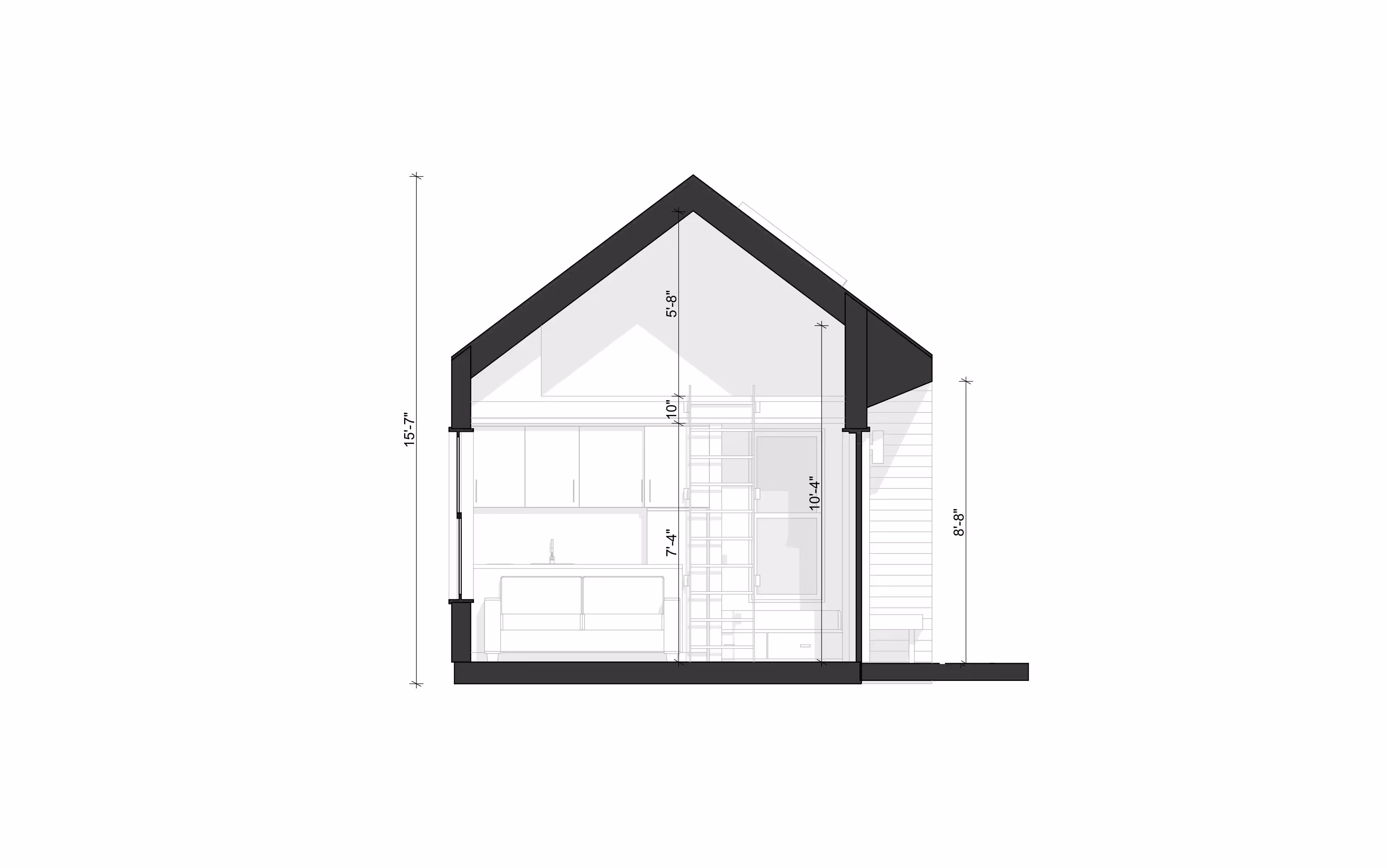 Featuring a wingwall that separates the living and sleeping areas, this modern ADU feels more like an apartment than a studio providing privacy and a spacious, comfortable living space.