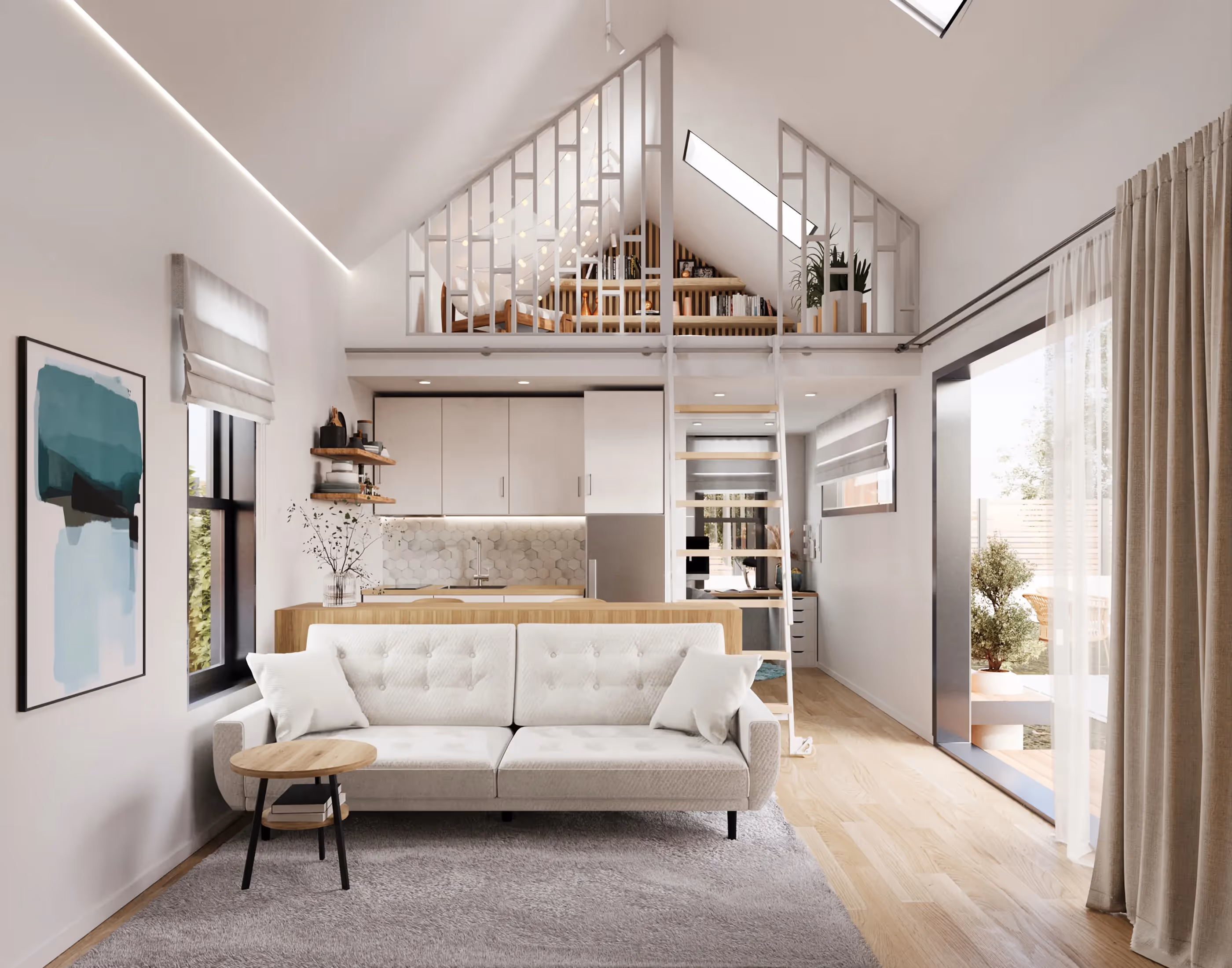 Our prefab ADUs come with premium kitchen cabinets, sink, fridge, cooktop, toilet, shower, vanity, and color choices for walls and flooring
