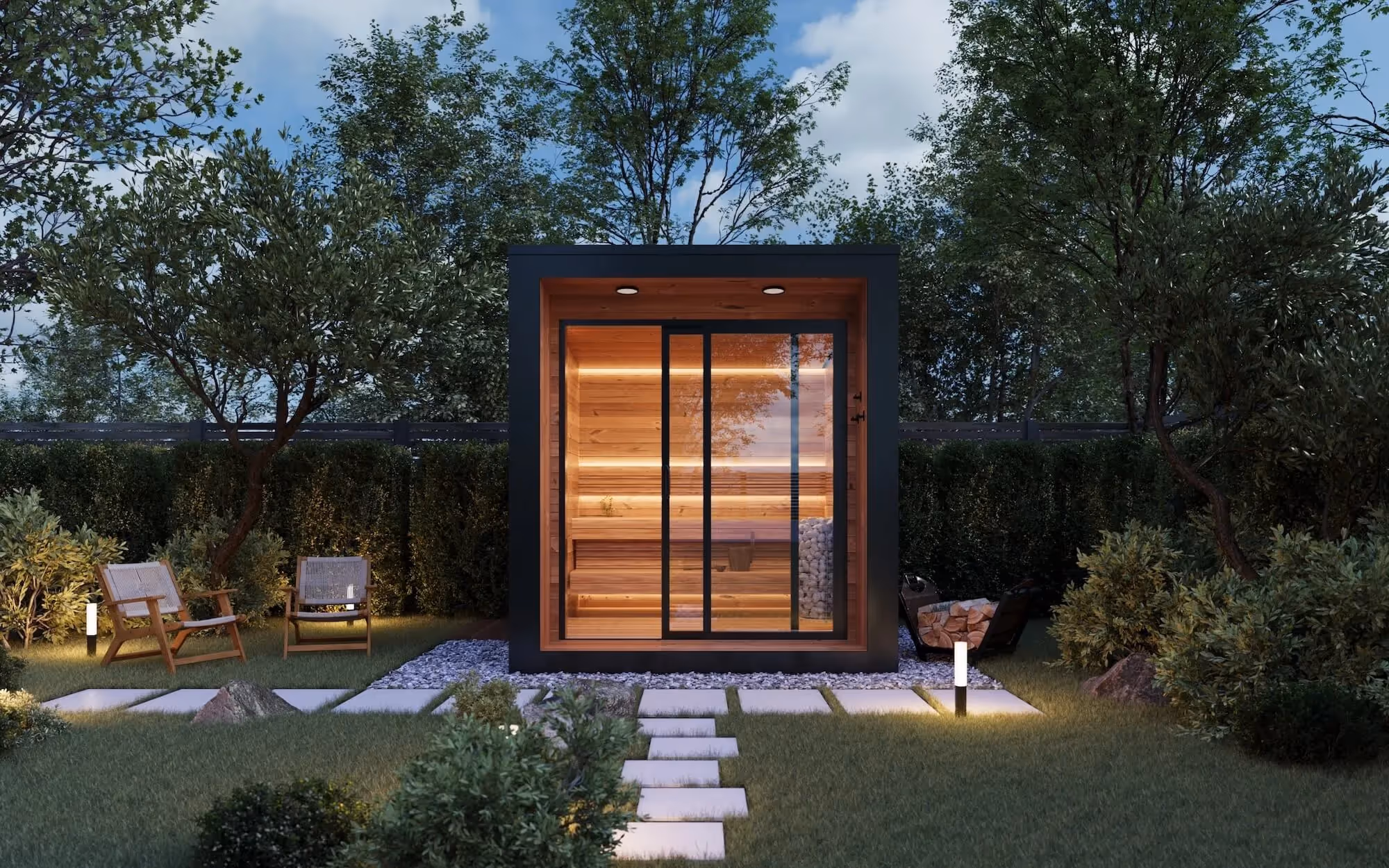Designed and fabricated in California, this Sauna can be built in most counties both within and beyond the state. With 54 sqft of space, it offers 2 rows of seating, integrated stone heater and built-in deck.